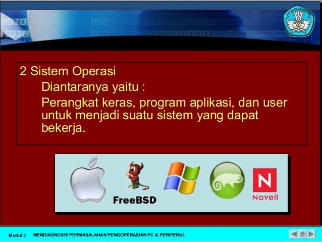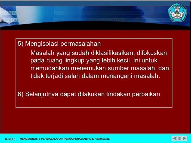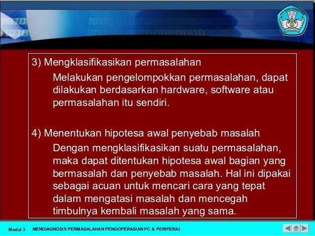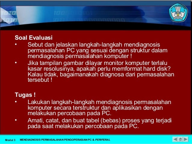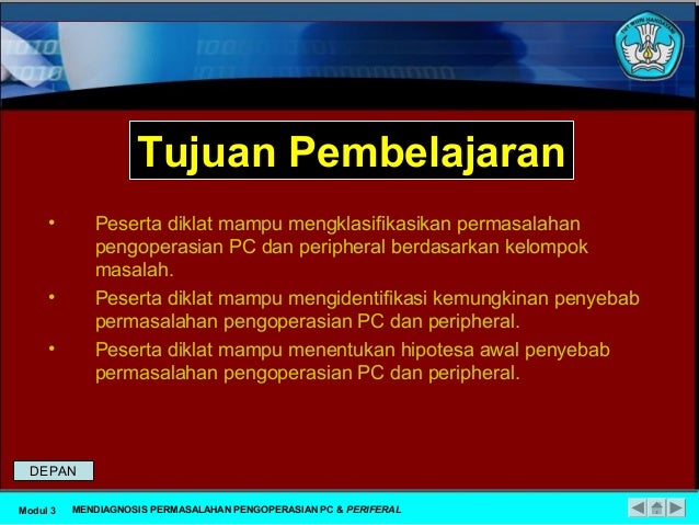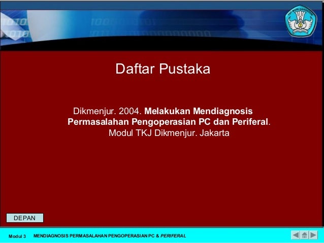 - 29. Dikmenjur. 2004. Melakukan Mendiagnosis Permasalahan Pengoperasian PC dan Periferal. Modul TKJ Dikmenjur. Jakarta Daftar Pustaka MENDIAGNOSIS PERMASALAHAN PENGOPERASIAN PC & PERIFERALModul 3 DEPAN