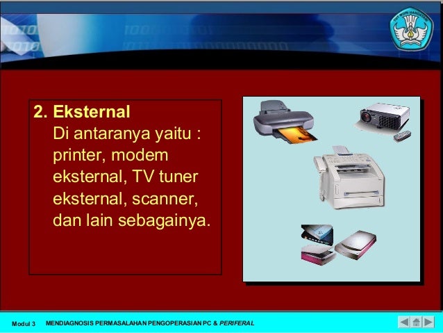 - 16. 2. Eksternal Di antaranya yaitu : printer, modem eksternal, TV tuner eksternal, scanner, dan lain sebagainya. MENDIAGNOSIS PERMASALAHAN PENGOPERASIAN PC & PERIFERALModul 3