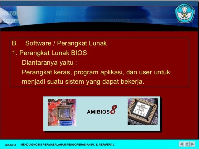 - 17. B. Software / Perangkat Lunak 1. Perangkat Lunak BIOS Diantaranya yaitu : Perangkat keras, program aplikasi, dan user untuk menjadi suatu sistem yang dapat bekerja. MENDIAGNOSIS PERMASALAHAN PENGOPERASIAN PC & PERIFERALModul 3