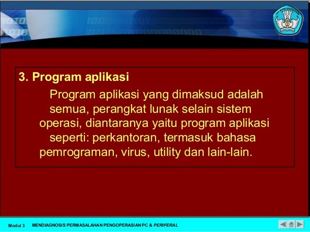 - 19. 3. Program aplikasi Program aplikasi yang dimaksud adalah semua, perangkat lunak selain sistem operasi, diantaranya yaitu program aplikasi seperti: perkantoran, termasuk bahasa pemrograman, virus, utility dan lain-lain. MENDIAGNOSIS PERMASALAHAN PENGOPERASIAN PC & PERIFERALModul 3