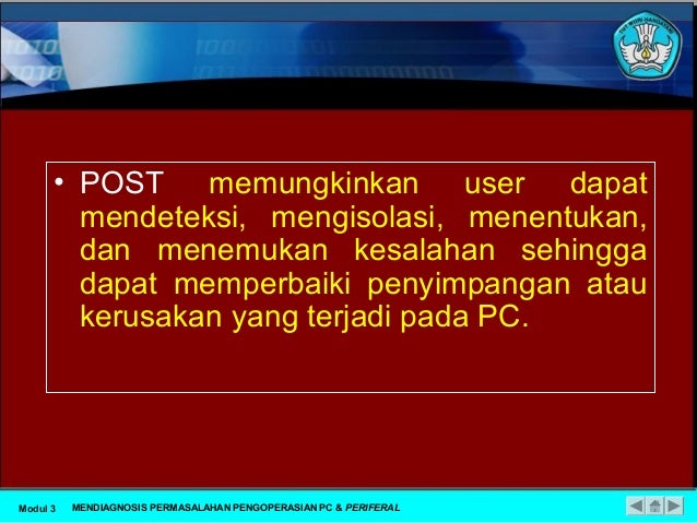 - 6. • POST memungkinkan user dapat mendeteksi, mengisolasi, menentukan, dan menemukan kesalahan sehingga dapat memperbaiki penyimpangan atau kerusakan yang terjadi pada PC. MENDIAGNOSIS PERMASALAHAN PENGOPERASIAN PC & PERIFERALModul 3