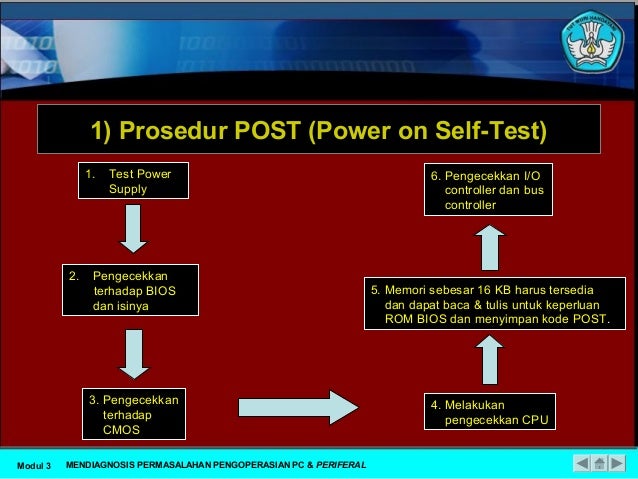 - 5. • POST (Power on Self-Test) yaitu test yang dilakukan oleh PC untuk mengecek fungsi-fungsi komponen pendukung PC apakah bekerja dengan baik. MENDIAGNOSIS PERMASALAHAN PENGOPERASIAN PC & PERIFERALModul 3