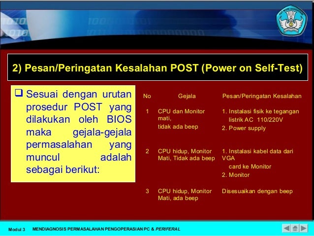 - 8. 2) Pesan/Peringatan Kesalahan POST (Power on Self-Test) Sesuai dengan urutan prosedur POST yang dilakukan oleh BIOS maka gejala-gejala permasalahan yang muncul adalah sebagai berikut: No Gejala Pesan/Peringatan Kesalahan 1 CPU dan Monitor mati, tidak ada beep 1. Instalasi fisik ke tegangan listrik AC 110/220V 2. Power supply 2 CPU hidup, Monitor Mati, Tidak ada beep 1. Instalasi kabel data dari VGA card ke Monitor 2. Monitor 3 CPU hidup, Monitor Mati, ada beep Disesuaikan dengan beep MENDIAGNOSIS PERMASALAHAN PENGOPERASIAN PC & PERIFERALModul 3