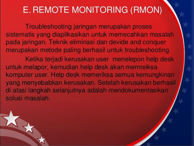 - 10. E. REMOTE MONITORING (RMON) Troubleshooting jaringan merupakan proses sistematis yang diaplikasikan untuk memecahkan masalah pada jaringan. Teknik eliminasi dan devide and conquer merupakan metode paling berhasil untuk troubleshooting. Ketika terjadi kerusakan user menelepon help desk untuk melapor, kemudian help desk akan memreiksa komputer user. Help desk memeriksa semua kemungkinan yang menyebabkan kerusakan. Setelah kerusakan berhasil di atasi langkah selanjutnya adalah mendokumentasikan solusi masalah.