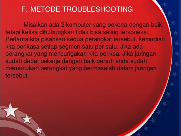 - 11. F. METODE TROUBLESHOOTING Misalkan ada 2 komputer yang bekerja dengan baik, tetapi ketika dihubungkan tidak bisa saling terkoneksi. Pertama kita pisahkan kedua perangkat tersebut, kemudian kita perikasa setiap segmen satu per satu. Jika ada perangkat yang mencurigakan kita periksa. Jika jaringan sudah dapat bekerja dengan baik berarti anda sudah menemukan perangkat yang bermasalah dalam jaringan tersebut.