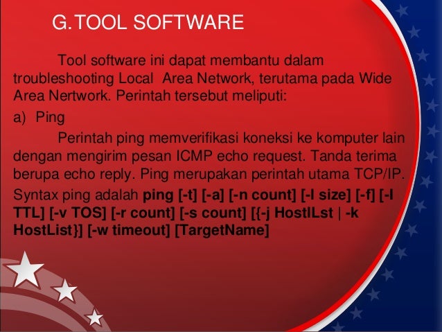- 12. G.TOOL SOFTWARE Tool software ini dapat membantu dalam troubleshooting Local Area Network, terutama pada Wide Area Nertwork. Perintah tersebut meliputi: a) Ping Perintah ping memverifikasi koneksi ke komputer lain dengan mengirim pesan ICMP echo request. Tanda terima berupa echo reply. Ping merupakan perintah utama TCP/IP. Syntax ping adalah ping [-t] [-a] [-n count] [-l size] [-f] [-I TTL] [-v TOS] [-r count] [-s count] [{-j HostlLst | -k HostList}] [-w timeout] [TargetName]