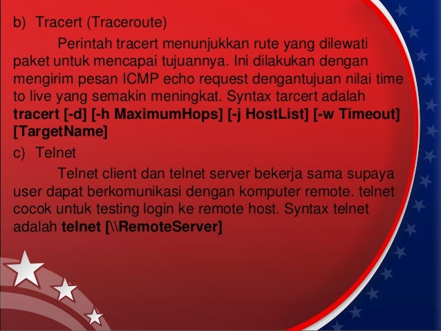 - 13. b) Tracert (Traceroute) Perintah tracert menunjukkan rute yang dilewati paket untuk mencapai tujuannya. Ini dilakukan dengan mengirim pesan ICMP echo request dengantujuan nilai time to live yang semakin meningkat. Syntax tarcert adalah tracert [-d] [-h MaximumHops] [-j HostList] [-w Timeout] [TargetName] c) Telnet Telnet client dan telnet server bekerja sama supaya user dapat berkomunikasi dengan komputer remote. telnet cocok untuk testing login ke remote host. Syntax telnet adalah telnet [RemoteServer]