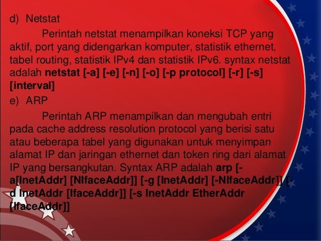 - 14. d) Netstat Perintah netstat menampilkan koneksi TCP yang aktif, port yang didengarkan komputer, statistik ethernet, tabel routing, statistik IPv4 dan statistik IPv6. syntax netstat adalah netstat [-a] [-e] [-n] [-o] [-p protocol] [-r] [-s] [interval] e) ARP Perintah ARP menampilkan dan mengubah entri pada cache address resolution protocol yang berisi satu atau beberapa tabel yang digunakan untuk menyimpan alamat IP dan jaringan ethernet dan token ring dari alamat IP yang bersangkutan. Syntax ARP adalah arp [- a[InetAddr] [NIfaceAddr]] [-g [InetAddr] [-NIfaceAddr]] [- d InetAddr [IfaceAddr]] [-s InetAddr EtherAddr [IfaceAddr]]