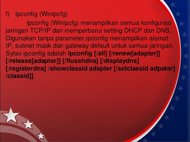 - 15. f) Ipconfig (Winipcfg) Ipconfig (Winipcfg) menampilkan semua konfigurasi jaringan TCP/IP dan memperbarui setting DHCP dan DNS. Digunakan tanpa parameter,ipconfig menampilkan alamat IP, subnet mask dan gateway default untuk semua jaringan. Sytax ipconfig adalah ipconfig [/all] [/renew[adapter]] [/release[adapter]] [/flusshdns] [/displaydns] [/registerdns] /showclassid adapter [/setclassid adpater] /classid]]