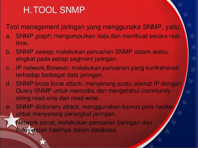 - 16. H.TOOL SNMP Tool management jaringan yang menggunaka SNMP, yaitu: a. SNMP graph; mengumpulkan data dan membuat secara real- time. b. SNMP sweep; melakukan pencarian SNMP dalam waktu singkat pada setiap segment jaringan. c. IP network Browser; melakukan pencarian yang konfrehensif terhadap berbagai data jaringan. d. SNMP brute force attack; menyerang suatu alamat IP dengan Query SNMP untuk mencoba dan mengetahui community string read-only dan read-write. e. SNMP dictionary attack; menggunakan kamus para hacker untuk menyerang perangkat jaringan. f. Network sonat, melakukan pencarian ljaringan dan menyimpan hasilnya dalam database.