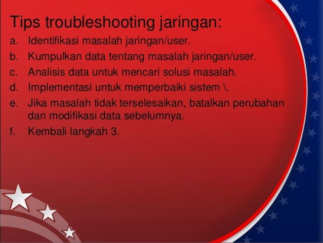 - 17. Tips troubleshooting jaringan: a. Identifikasi masalah jaringan/user. b. Kumpulkan data tentang masalah jaringan/user. c. Analisis data untuk mencari solusi masalah. d. Implementasi untuk memperbaiki sistem . e. Jika masalah tidak terselesaikan, batalkan perubahan dan modifikasi data sebelumnya.