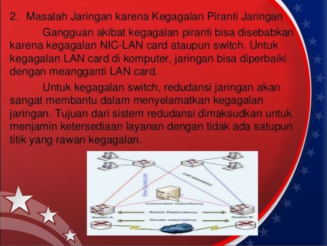 - 4. 2. Masalah Jaringan karena Kegagalan Piranti Jaringan Gangguan akibat kegagalan piranti bisa disebabkan karena kegagalan NIC-LAN card ataupun switch. Untuk kegagalan LAN card di komputer, jaringan bisa diperbaiki dengan meangganti LAN card. Untuk kegagalan switch, redudansi jaringan akan sangat membantu dalam menyelamatkan kegagalan jaringan. Tujuan dari sistem redudansi dimaksudkan untuk menjamin ketersediaan layanan dengan tidak ada satupun titik yang rawan kegagalan.