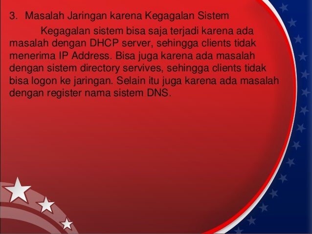 - 5. 3. Masalah Jaringan karena Kegagalan Sistem Kegagalan sistem bisa saja terjadi karena ada masalah dengan DHCP server, sehingga clients tidak menerima IP Address. Bisa juga karena ada masalah dengan sistem directory servives, sehingga clients tidak bisa logon ke jaringan. Selain itu juga karena ada masalah dengan register nama sistem DNS.