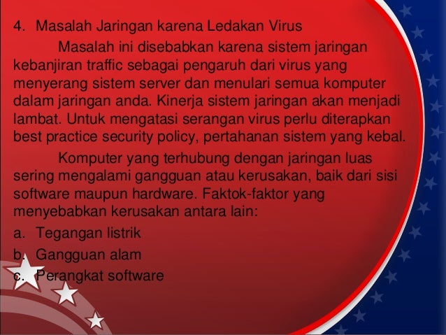 - 6. 4. Masalah Jaringan karena Ledakan Virus Masalah ini disebabkan karena sistem jaringan kebanjiran traffic sebagai pengaruh dari virus yang menyerang sistem server dan menulari semua komputer dalam jaringan anda. Kinerja sistem jaringan akan menjadi lambat. Untuk mengatasi serangan virus perlu diterapkan best practice security policy, pertahanan sistem yang kebal. Komputer yang terhubung dengan jaringan luas sering mengalami gangguan atau kerusakan, baik dari sisi software maupun hardware. Faktok-faktor yang menyebabkan kerusakan antara lain: a. Tegangan listrik b. Gangguan alam c. Perangkat software