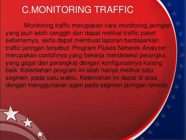 - 8. C.MONITORING TRAFFIC Monitoring traffic merupakan cara monitoring jaringan yang jauh lebih canggih dan dapat melihat traffic paket sebenarnya, serta dapat membuat laporan berdasarkan traffic jaringan tersebut. Program Flukes Network Analyzer merupakan contohnya yang bekerja mendeteksi perangka yang gagal dan perangkat dengan konfigurasinya kurang baik. Kelemahan program ini ialah hanya melihat satu segmen pada satu waktu. Kelemahan ini dapat di atasi dengan menggunakan agen pada segmen jaringan remote.