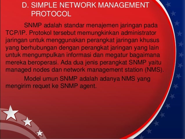 - 9. D. SIMPLE NETWORK MANAGEMENT PROTOCOL SNMP adalah standar menajemen jaringan pada TCP/IP. Protokol tersebut memungkinkan administrator jaringan untuk menggunakan perangkat jaringan khusus yang berhubungan dengan perangkat jaringan yang lain untuk mengumpulkan informasi dan megatur bagaimana mereka beroperasi. Ada dua jenis perangkat SNMP yaitu managed nodes dan network management station (NMS). Model umun SNMP adalah adanya NMS yang mengirim requet ke SNMP agent.
